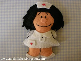 Otra Mafalda para la colección. Esta vez ha colgado su clásico vestido rojo y se ha puesto un uniforme de enfermera. Al igual que la Mafalda que hice anteriormente tiene unas medidas de 9 x 6 cm