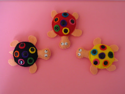 Continuando con mi zoo particular, he añadido unas alegres tortuguitas de colores. Tienen en el caparazón unos detalles con lentejuelas negras que les dan un brillo muy especial. Miden 6 cm .