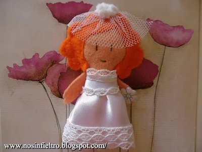 Aquí teneis un nuevo broche "muñequita Iris". A este modelo, por razones obvias, le he llamado Iris "Novia". Va con su vestido de raso y hasta con el tradicional velo. ¿Os gusta?