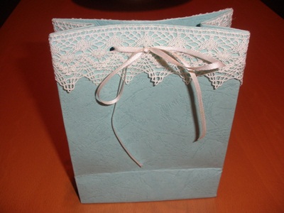 Y este último es una idea mía, está hecho con una bolsita. Le he quitado las asas y he pegado una puntilla. Por los agujeritos he metido una cinta para poder cerrarla con una lazada.