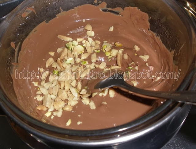Una vez derretido el chocolate a fuego lento lo apagamos, echamos los frutos secos y mezclamos. Antes de echar los frutos secos los aplastamos un poco con el rodillo.